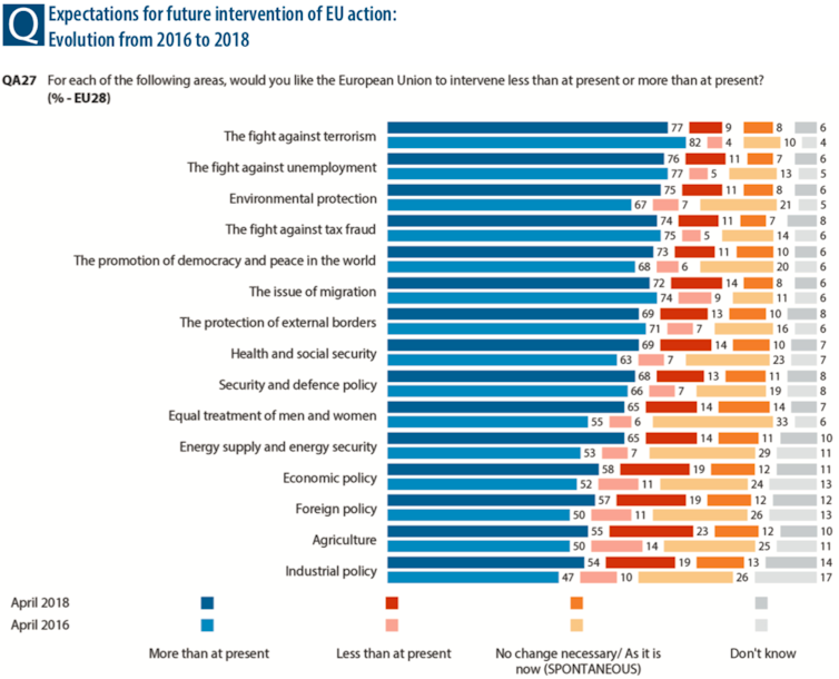 L’Union européenne dispose donc de moyens limités pour agir dans des domaines tels que l’immigration, la protection sociale, la lutte contre le terrorisme, etc. Pourtant, c’est sur ces questions relatives à la protection de leurs intérêts stratégiques, de leurs modes de vie, et de leurs préférences en termes de modèles économiques et sociaux que les citoyens attendent davantage de leur appartenance à l’UE, comme le révèle un sondage Eurobaromètre réalisé en septembre 2018 par le Parlement européen.
